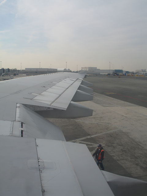 Well, it being a Wednesday early evening, it would be obvious to almost anybody that the traffic getting to the airport would be horrendous, wouldn't it? It wasn't obvious to us. We usually get to JFK in about an hour and a half. This time it took two and half hours. We got to the Gamma terminal at about 6:30, only to discover a long, long, line of people, waiting to get into the entrance door! That's right -- they weren't waiting to check bags, or to go through some kind of security check, they were waiting to get into the building! We had to walk past about a hundred or so people to get to the end of the line. We thought, "there's no way we're making this flight". Luckily, after a few minutes, a Gamma employee came to the end of the line and told a bunch of us to follow her to another entrance, where there was no line. We never found out why those people were in line to get into the building.