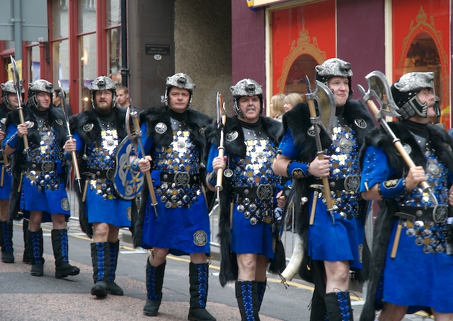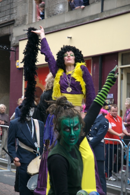 It wasn't exactly the kind of parade we were expecting though -- mostly very strange people, in very strange costumes. Yes, some bagpipers, and marching bands were there too. We waited for the queen to ride by, thinking that this was a pretty undignified parade for her to be in. The parade came to an end -- no Queen. That evening, back at our hotel, we asked where the Queen was. They told us that she wasn't in the parade, but was viewing it from a viewing stand near Holyrood. Oh yes -- Holyrood. We never got to see Holyrood because it's closed to the public when the Queen is in residence. Bummer! I later figured out why all the strange people were in the parade. Edinburgh is famous for its "Fringe Festival" which occurs during August. These people were probably street performers getting ready for the festival. Or -- maybe just weird Scots. Who knows?
