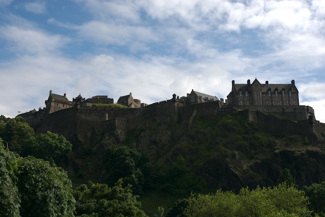 Edinburgh is the first place we visited in Scotland. Note that it is pronounced like Ed-in-burrow (Rhymes with Edward R. Murrow, for you oldies out there like us). Edinburgh is a lovely small city. It has managed to preserve the medieval buildings as well as the 18th and 19th century buildings that make up much of the city. It is divided into two parts, the Old Town and the New Town. The Old Town dates from medieval times, and there are parts of buildings there that were built in the 12th century. The new town was built in the 18th century, by rich people who didn't like living in the run-down, dirty, smelly, rat-infested old town anymore. Fortunately for us, the Old Town has gotten rid of the smell and the dirt and probably most of the rats. We spent several days in Edinburgh, and we liked it there. Of course, we had to visit Edinburgh Castle, which is a huge, impressive edifice, which can be seen from most of the town.