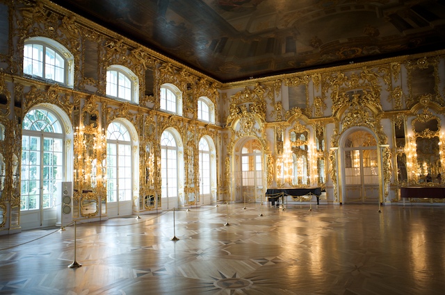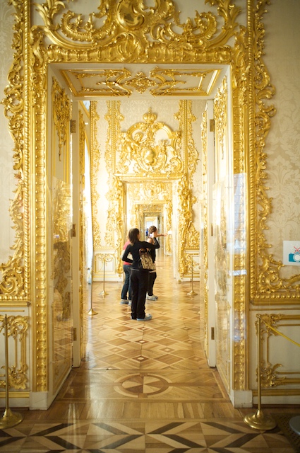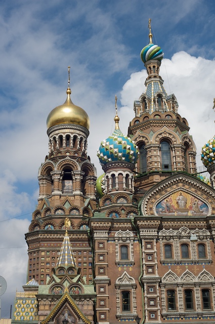 Sergey and our new driver (Gyorgi had other commitments) picked us up at 9:00. Our new driver is Dmitri. Donnie really wants to get Dmitri's picture because he looks exactly like a KGB agent. Big, burly, grey hair in a buzz-cut, wearing a suit. Could be he's not just our driver but also our bodyguard? We drove this morning to the town of Pushkin (named after the Russian poet) which has Catherine the Great's summer palace (yet another palace!). Sergey took us through the palace and gave us his usual detailed descriptions. We are getting somewhat embarrassed at all these places because Sergey, as an official guide, gets us in ahead of everybody on line. More tons of gold leaf, more parquet floors, more antique furniture, and portraits of Russian nobility. After wandering through this palace and gardens, Dmitri drove us to the next place on our itinerary - another palace! This one is Czar Peter the First's palace in the town of Petrovsk, not far from Pushkin. Slightly different - it had less gilding! I was getting palace overdose, but we made it through and drove back to St. Petersburg where we had a late lunch (about 2:00) with Sergey in a little cafeteria, and said good afternoon to him. Fortunately, by this time, the sun had come out and it was another beautiful day. Earlier, Sergey had told us, in no uncertain terms, that we MUST see the Russian Museum, which houses art by Russian artists. Since we knew that we would be tested on it the next day (Sergey is a college professor, a teacher, a lecturer and a book author). Tired as we were, we decided to go to the Russian Museum.On the way, we went past the "Church of the Spilled Blood" which was built directly on the spot where Czar Alexander II was killed, supposedly on top of the bloody stones. The church is very colorful on the outside and has onion domes, which Sergey finds distasteful because they don't fit the "European" character of the rest of St. Petersburg. We then walked to and through the Russian Museum, and we did see a few interesting things, but we were really too tired to enjoy it much and so after a couple of hours or so we started the long walk back to the hotel. This time we took a route that avoided Nevsky Prospekt. I am writing this in our room at about 7:00 p.m., and Donnie is napping. Later we will probably go down to the coffee shop to use their wifi to send this, and then maybe go to dinner, if we can find the energy. Tomorrow we meet Sergey and Dmitri at 10:00 instead of 9:00 so we can sleep a little later, and then they will take us to - ANOTHER PALACE!