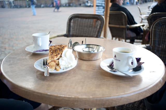 The train station was like most in Europe, with a big glassed in cover over the tracks, but the middle of this station was the old station from the art deco period of the early 1900's, with lots of beautiful wood panels and beveled glass windows, and tiles. We took lots of pictures. We then walked a few blocks from the train station to the center of town. This is easy to do in many European cities and towns because there are signs everywhere saying "centrum" or "zentrum" or something similar. We got to the old part and started taking lots of pictures. We wandered the old streets for a while, and then got to the old market square, called the Grote Markt. It was surrounded by pretty, old buildings and the lovely old St. Bavo Church, and it had several cafes and restaurants with outdoor tables, and, of course, a herring stand. We decided to sit at one of the cafes and have coffee and apple pie with whipped cream.