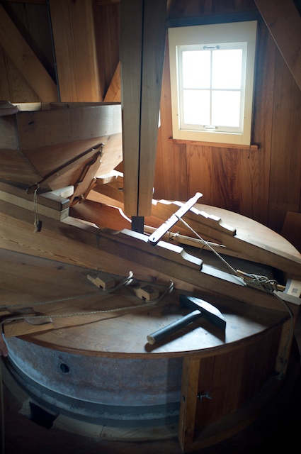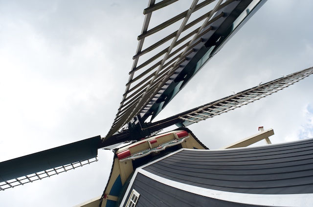 After a few minutes, we suddenly saw the windmill, right in the middle of a residential district, surrounded by streets full of houses. We walked up to the windmill and started snapping pictures like crazy, and after a minute or so, a man approached us and asked if we wanted to see the windmill. We said yes, and he said that the last tour was just starting, so we went with him into the base of the windmill. He was the guide, and gave us and a small group of French people a wonderful tour of the windmill, in English because he had very little French. The tour started with a small video presentation, which was very interesting. It started with a man playing the Irish-style bagpipes, so we assumed that they were also a Dutch instrument. Later we asked the guide, and he said that the video surprised him also, because he was unaware of such an instrument being used in the Netherlands. The video also showed an old movie clip of the windmill on fire in the 1930's. It burned down, and was only rebuilt in 2002!The guide then took the group up into the windmill, floor by floor, showing us models of how the windmill was constructed, and how it was used. It was used for different purposes over the years, including a sawmill, grain mill, and others. We also saw a video of the miller setting the sails. To get to the upper floors, we had to climb several flights of very, very steep narrow stairs, just like ship's ladders. Later, to come down, you had to come down backwards! The windmill tour was a kick.