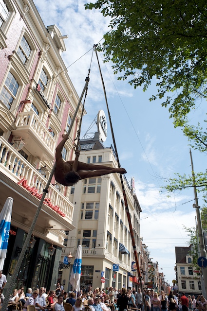 After the museum, we decided to go to an area called Neuwmarkt, which involved two trams and a subway ride. After taking the first tram, we were in an area full of outdoor cafes and pubs, and decided to have lunch before continuing. We were sitting at the outdoor cafe, waiting for our lunch to arrive, when we noticed, very close to us in the area between two cafes, a very small cart, out of which was extended a long pole connected to some overhead wires. Dangling from the pole was a heavy rope, and attached to the rope were some hand-grips. This was very curious. After a few minutes, an older man, maybe 70 years old, walked up to the cart, opened the box, and began fiddling with things in it. Then he tried to get the attention of the people in the cafes by waving his hands around. Then, he took off his shoes. Then, he took off his shirt, showing an old, but muscular chest. Then, he took off his pants! He was wearing a very small bright green thong underneath (thank goodness!). He then proceeded to climb the rope and perform an aerial act, taking various difficult and dangerous positions in the air, while hanging from the rope. Afterward, still dressed only in his thong, he walked among the cafe tables accepting coins from the crowd. Then he went back to his cart, dressed, and walked away. A few minutes later, in almost the same place, a group of Latin-American-looking musicians arrived, including a saxophonist and bass-fiddle player, and played everything from "La Bamba" to cool jazz.