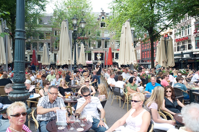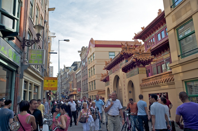 The canals and bridges were lined with tens of thousands of people. The parade was taking place on the main canal, and was made up of boats and barges, lending new meaning to the phrase "parade float". The parade boats had people in outrageous costumes, with loud music. There were many people in the crowd dressed outrageously also with colorful hats, feather boas, t-shirts, etc. We wandered around for a while in the crowd, taking pictures and watching the parade. Then, the parade started to wind down, as did we, so we decided to find a cafe for a cool drink. Since the whole area was jammed with people, it took a while to find a cafe with some empty seats, but we finally did. We then decided to walk past the Oude Kirk (Old Church) which we had intended to visit some time during the week. The Oude Kirk sits in the middle of the famous Red-Light district, which we had avoided up to this point. The guide book said that the streets directly around the Old Church were a "quiet oasis" within the Red-Light district. The guide book was wrong. There were several establishments directly opposite and around the Church, including one or two that were open for business, with the ladies displaying their wares. They literally had red fluorescent lights above the windows. We walked through the area, and then we walked down another street, and discovered we were in "Chinatown". This was a street, three or four short blocks long, full of Chinese restaurants and shops, and a small Buddhist temple. We were very tempted to stop and eat there, but we weren't really very hungry. We walked back to the hotel, rested for a while, and then went to dinner around 8:30. We weren't sure where to eat, and wandered around a bit, until about 9:00 and we ended up in an Indonesian restaurant. Amsterdam has restaurants of every cuisine in the world. There are lots of Dutch restaurants, of course, and a lot of Indonesian places, since the Dutch were once the colonizers of the Dutch East Indies, now Indonesia. There are also Chinese (spelled Chinees in Dutch), Malaysian, Italian, quite a few Irish Pubs, a lot of Argentinean restaurants, for some reason, and almost anything else you could imagine. After dinner, at about 11:00, we went to O'Reilly's Irish Pub for some pear cider!