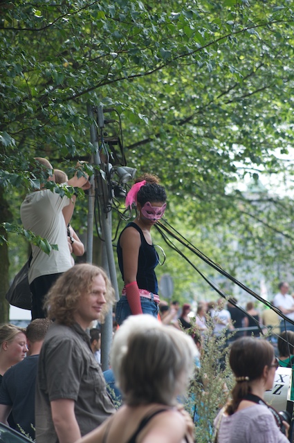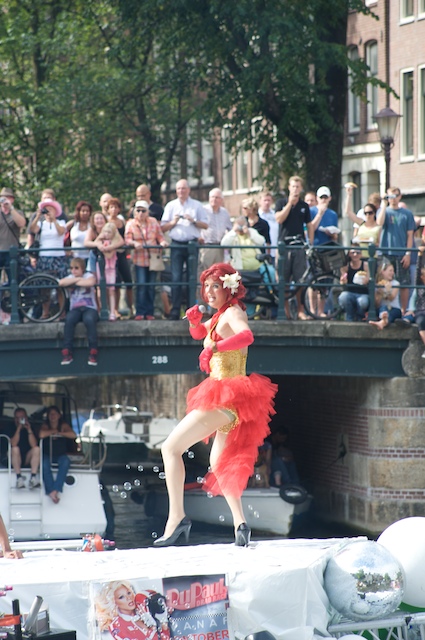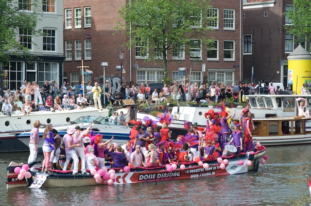 After the interesting lunch, we took the next tram to the subway stop, and took the subway. Since the trams, and trains and buses we had taken were all very clean, we were a bit surprised to see the insides of the subway cars were not as clean and filled with graffiti. When we got to our destination, we saw a large number of people, about a block away, standing on one of the many bridges over the canals. We knew why they were there. This was "Gay Pride" weekend in Amsterdam, and we had heard that today a parade was scheduled. There were many, many people wearing Pink! Oops! I should have worn a different color shirt! We had originally decided to try to avoid the crowds, but Donnie suggested we go take a look.