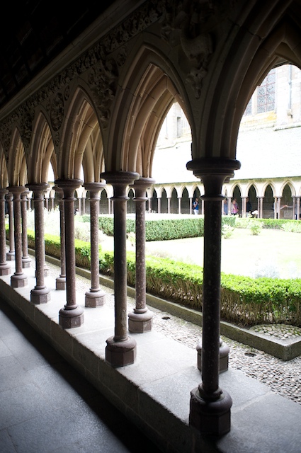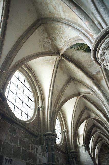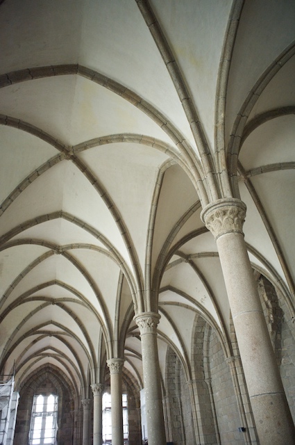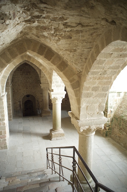 The church at the very top of the mountain was first built in the 8th century and had been replaced and added to many times over the centuries. There were many rooms under the church which our guide took us to and described. There were various chapels for worship, rooms for the monks to eat in, cook in, meditate and pray in, store food in, receive the poor pilgrims in, entertain kings in, etc. etc. The place was huge, actually encompassing several buildings, each building having three or more levels, the whole thing balanced at the pointy top of a mountain. She told us that the small area that was the crossing of the nave and the transept of the church was the only part of the structure that was actually sitting on the rock of the mountain, and that the rest was supported by the lower levels of the various structures and rooms that were below the church level.