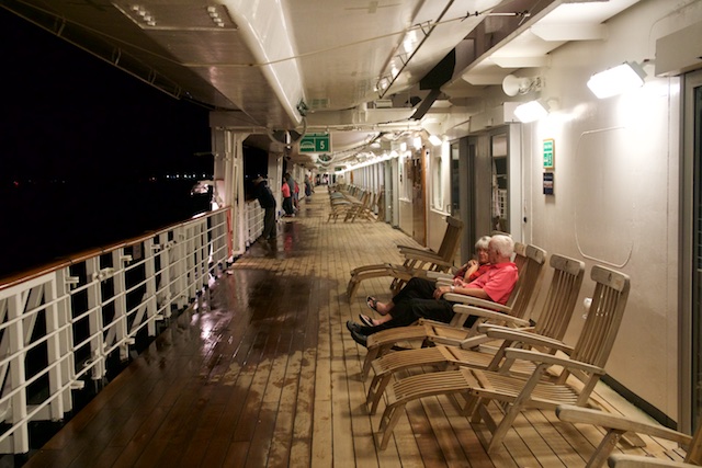 This first day narrative is already too long, so, in brief, we had a late light lunch in the buffet, did a little exploring of the ship, attended the mandatory muster drill, which has been completely different on each of our three cruises, unpacked our bags after they arrived at our room, met our cabin steward, who was from Jakarta, Indonesia, so of course Donnie had to tell him that she had been there, had drinks in the very attractive Crow’s Nest Bar which had lots of windows looking out of the front of the ship, and then had a light dinner in the buffet. In summary, the day went very well, the ship seems to be beautiful, the food in the buffet was a slight disappointment so far, but all-in-all an excellent, if busy and tiring, first cruise day, although we won’t actually be cruising until 10 tonight. It’s 9:14 as I write this.