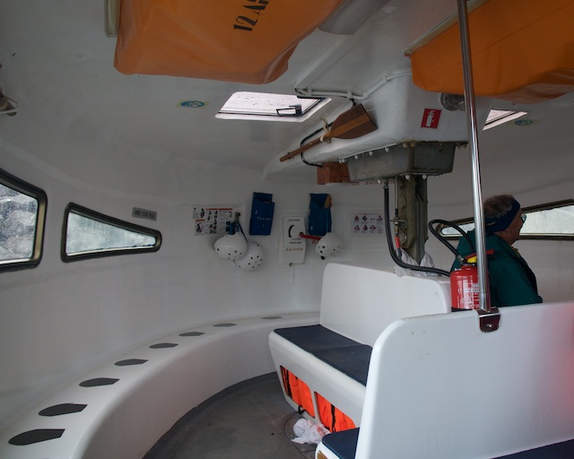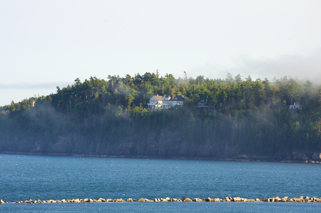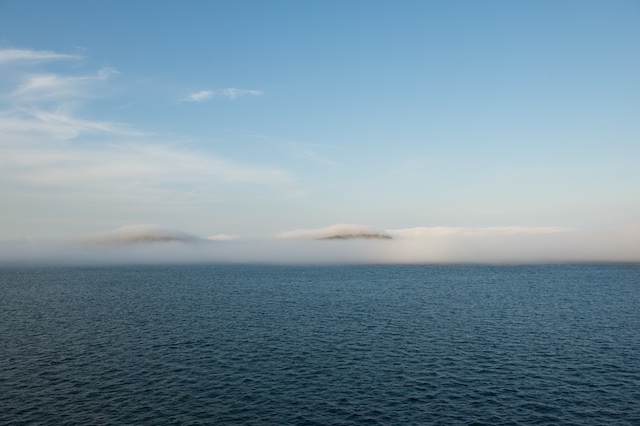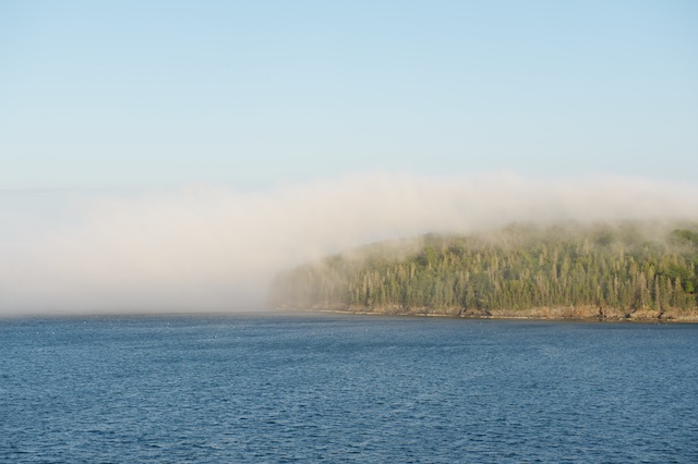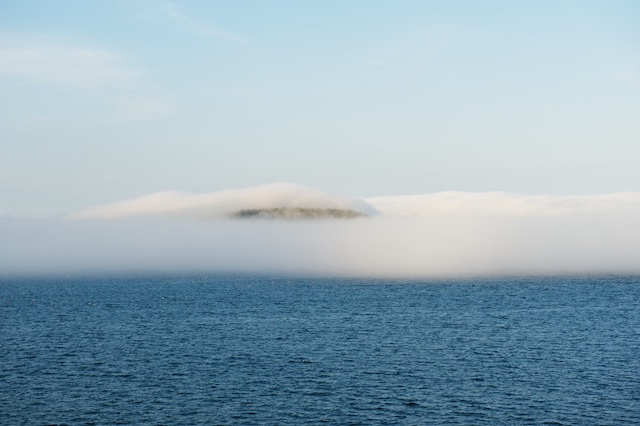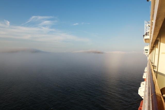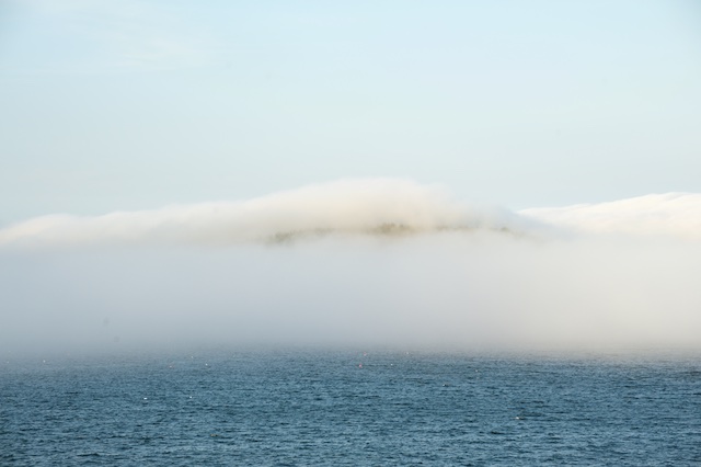 We then went and explored the ship some more and while we were doing so Donnie looked out a window and saw the most incredible sight. Bar Harbor itself was in the sun but the islands off shore and the sea around them were covered in what looked like whipped cream, which was really dense low-level fog rolling in. It was like something out of a science fiction movie. We rushed back to our cabin to get our cameras and went out onto our balcony and took some remarkable pictures. While we were doing so, the ship started moving and was moving into the fog. Then we heard the ship’s foghorn and soon we were inside the fog and nothing was visible anymore.