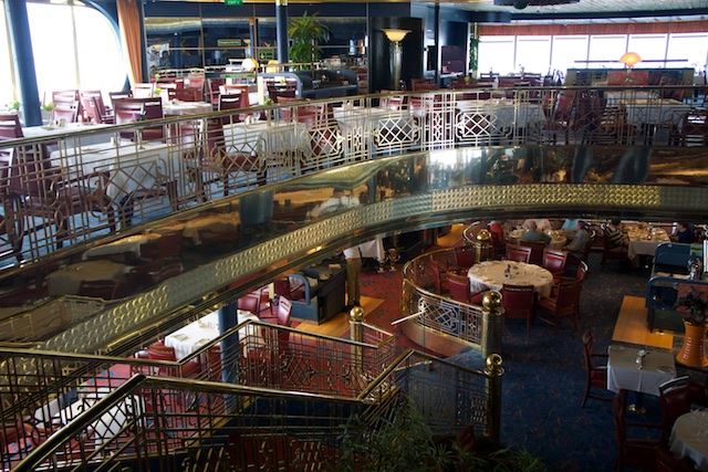 We got up a little late this morning and decided to try breakfast in the main dining room. The dining room on the M.S. Rotterdam is on two levels. The dining room on deck four is for the “anytime, any table” diners, like us, and the one on deck five is for the “fixed time, fixed seating” people. These distinctions only apply at dinner, but we didn’t know which level to go to for breakfast so we went to deck five. Nobody was there, so we figured maybe we should try deck four. Aha! There was a line of about ten or so people waiting to get in. The line moved very slowly, even though we could see that there were many empty tables in the dining room. Strange. Eventually we got in and were seated and had a reasonably good breakfast, although the service was a bit slow and there were a lot of tables where the leftovers and dirty dishes had not been removed. Somebody had said that this ship was understaffed.