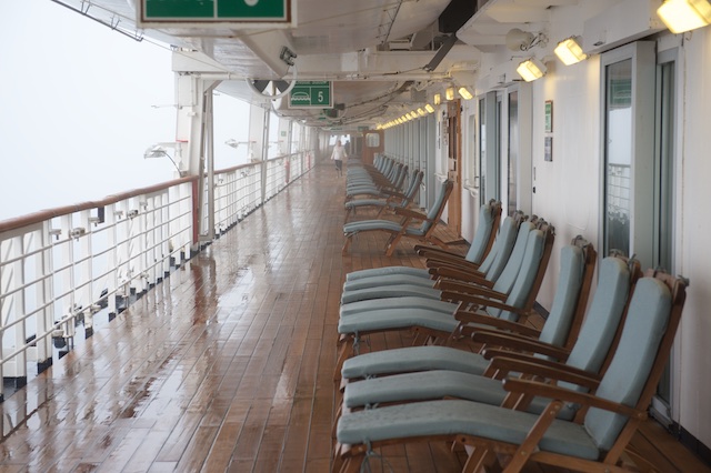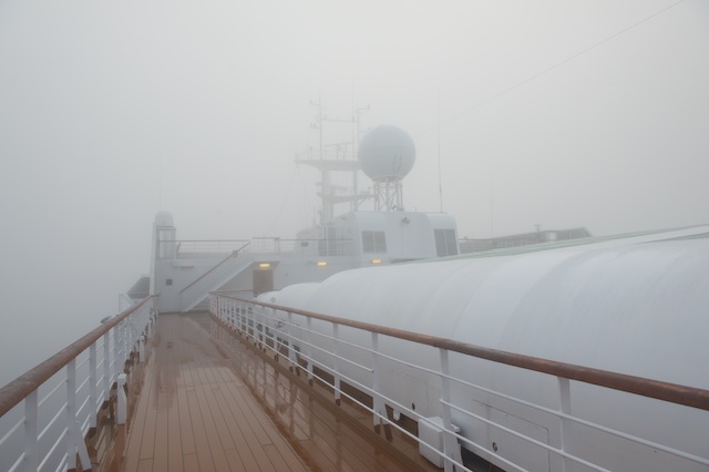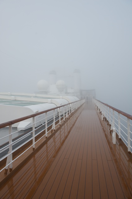 Last night I was awakened a few times by the low, plaintive, other-worldly sound of the ship’s foghorn, but otherwise I slept well. I was lying in bed, half awake about 6:30 this morning, which was really 5:30 body-clock time, since we had to set our clocks one hour forward last night because we are crossing into a new time zone, and I heard the fog horn again. I then, with my sleepy brain, realized that we were still surrounded by fog, over 12 hours after we had first seen it yesterday. My sleepy brain then got the idea that I would probably never have the opportunity again to take pictures on a ship enclosed in fog, so I got up as quietly as I could so as not to awake my sleeping wife, brushed my teeth, dressed quickly, put on a warm jacket because I didn’t know how cold it would be on deck, grabbed at what felt like my fleece hat and shoved it in my pocket, grabbed my camera and went out. At 6:30, much of the inside of the ship was deserted, but when I got out onto the lower Promenade deck, there were a few hardy early morning walkers. The fog was thick. You couldn’t see more than a few feet of ocean. When I went up to the top deck, the funnels were covered in fog and you could barely see them from the front of the ship. It was very eerie, and worth getting up to see.