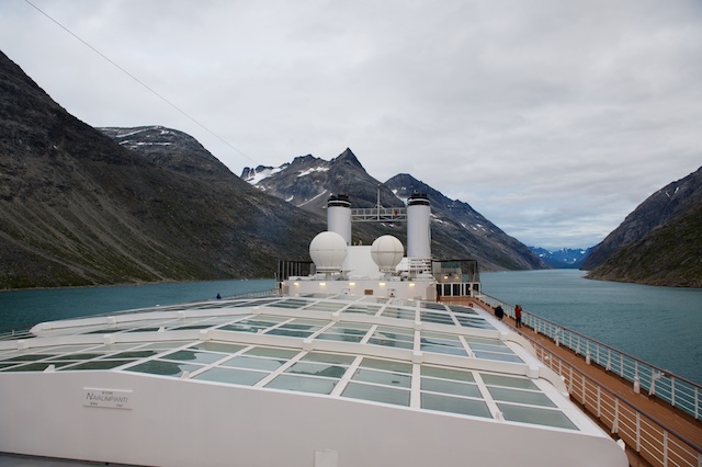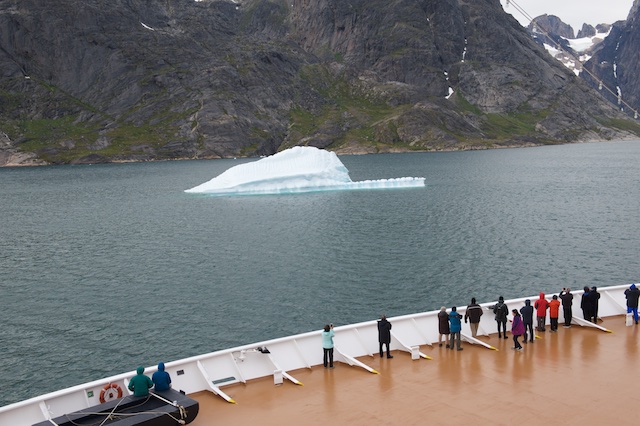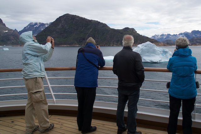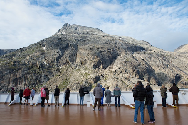 So, we set our alarm for 6:00 AM so we would be washed and dressed and all perky at 7:00 for the big event. As often happens, we woke up about ten minutes before the alarm went off, and looked out the balcony glass door. Bang! Pow! First head explosion. There were sheer rock walls outside our balcony, exceedingly close to the ship. There was green water. There were icebergs, small ones, but icebergs. The sky was overcast, but there was no rain, and no fog. We quickly washed and dressed and headed up to deck nine, the so-called “sports deck” which is at the top of the ship and has a big outdoor area and unrestricted views on either side. Kaboom! Second brain explosion. Mountains… Cliffs… Glaciers… Waterfalls… Icebergs… The scenery cannot be described. Even the many, many, many pictures we took during the day cannot do it justice. I lost count of the number of glaciers we saw. I can’t even guess how many icebergs we saw.