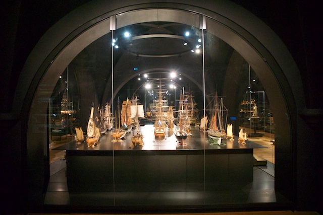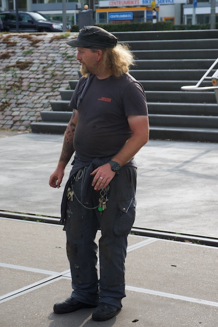 As we were standing there, suddenly a guy walked up to us and said something in Dutch. We said “Hello”, and he switched to very good, but accented English. He was wearing a Maritime Museum T-shirt, and he starting telling us about some of the boats we were looking at. He was a “character” if I ever saw one. He had on dirty jeans and a dirty Maritime museum T-shirt. There were dozens of keys attached to his belt. His hair was crinkly and long and sort of tied into a frizzy, messy ponytail. His beard was also crinkly and long. He had a big pot-belly. He had lots of tattoos on his arms, the only part of his body that was uncovered. (I don’t want to speculate on any other tattooed areas). He wore a dirty-looking rag as a bandana, and an engineer’s hat on top of it. He had pierced ears and had those ring-things that aren’t earrings but in fact expand the hole in the earlobe. Since he never told us his name, and I thought of him as a Young Old Salt, I’m going to call him Yos. It sort of sounds Dutch. He was in his forties, maybe.