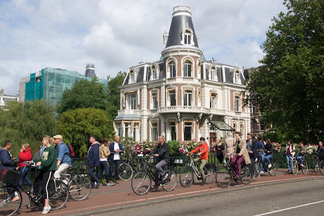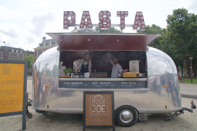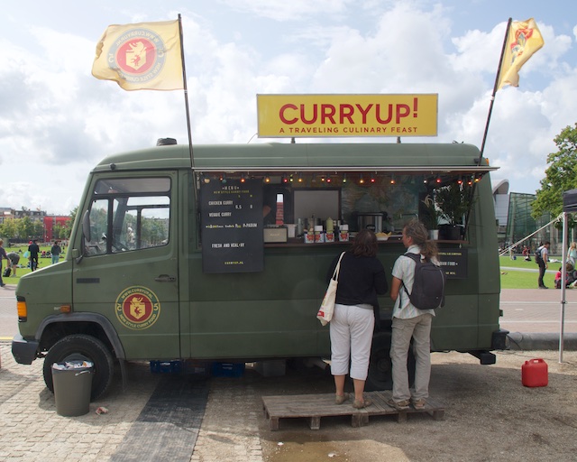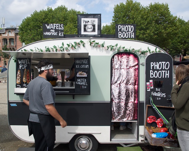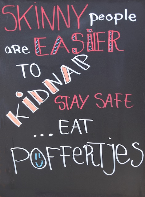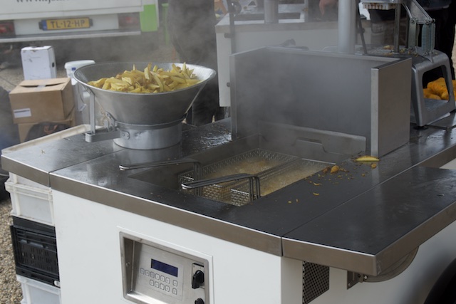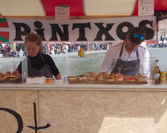 We never made it to the Van Gogh museum. This isn’t a total disaster, since we had been there once before (completely and utterly BX6!). We walked around the market, which had covered stalls where people were selling art and crafts, and a few antiques (junk). Then, at one end, we ran into the food area. Here’s a partial list: Basque Pinxto’s (small open-faced sandwiches which we had adored in Barcelona), Pizza, American Hot Dogs and Burgers, Indian food sold out of a WW II ambulance truck, a small camper type trailer selling “Waffle Pops” and a Photo Booth (in the same trailer), Papa Joe’s Pasta in a shiny, polished, small Airstream trailer, Hand cut, freshly fried French Fries, in little paper cone that was folded in such a way that there was a little second cone on top to hold the mayonnaise (yes, some European countries like mayonnaise on their fries), Chinese dumplings and steamed buns, American BBQ, a guy selling Hard Cider and fresh squeezed apple juice. We had some of the apple juice. He put an apple into a press and pulled down the big handle and handed us a plastic glass with some really good, and obviously very fresh apple juice. Donnie started a conversation with him about the kind of apples they were and in his Dutch accented English he enjoyed telling her all about the apples.
