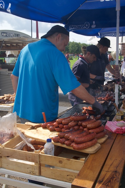 Then, I saw them. I smelled them. I heard them. The smell alone would make anyone hungry. There were some tables next to a big charcoal barbecue grill, and on one of the tables was a big pile of sausages. Huge, fat, red, garlic sausages. These things would break your foot if you dropped one on it. On the grill were lots of them, sizzling, many of them beautifully charred down the side. There was a long line of drooling people. They were selling 1/2 of a sausage, cut lengthwise, (nobody could eat a whole one) for six Euros on a piece of bread, or five Euros on a stick. You went to the end of the line, told the lady what you wanted and paid her, and she handed you a little wooden tile with engraving on it indicating what you were getting. Then you went to the guy manning the grill and handed him the tile. I got a half sausage on a stick, slathered in mustard. What can I say. BX5! The best garlic sausage ever. Donnie only had a bite, but I devoured the rest. I might have been able to have another half, but I resisted.