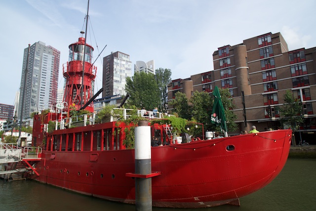 So after all this, it was already close to 2:00 when we had to be back at the meeting point to get the bus back to Rotterdam, so no Van Gogh museum this time. We got back to the ship about 3:30, went to the room to freshen up a little, and since it was a beautiful day, decided to go back out and walk around Rotterdam. We had planned to do this the second day in port, but it was so nice out and we weren’t tired, so out we went. We walked from the ship across the very modern Erasmus bridge and headed toward the center of town. We reached the Maritime Museum, or at least the outdoor part of it, which was an inlet with lots of old boats: tugs, barges, little tiny steam boats, and cranes, maritime equipment of all kinds. One thing was like a barge with a huge, complicated machine rising up out if it, with all kinds of pipes and wheels and gadgets. It looked like something out of a Miyazaki movie, if you know what that is.