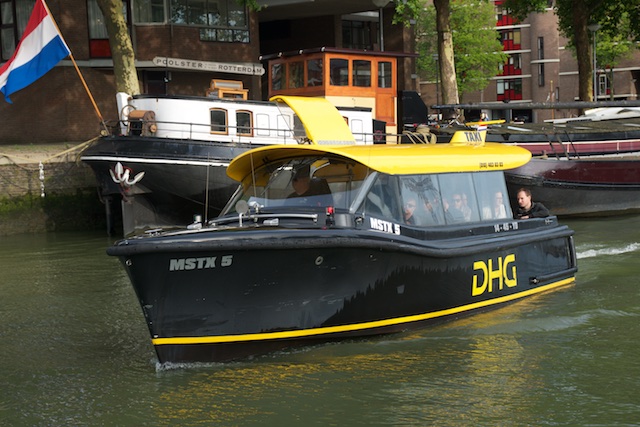 There was a bit of a delay, but when the water taxi came, it was kind of startling. It is a little, tiny, enclosed boat with only 10 seats, not much bigger than an SUV, and the driver sits up front on the right, right in front of a lift-up door. The taxi that came for us had a lady driver, and she zipped that boat around and pulled it up to the dock in one swift turn, reached out with her right hand, without getting up or taking her left hand off the wheel, lifted open the door and tied the ship up to the dock. (MB3!) The Dutch couple got on and a few other people and so when we got to the door and said to the lady driver that we were two for Hotel New York, she said, “Perfect, the boat’s now full”.