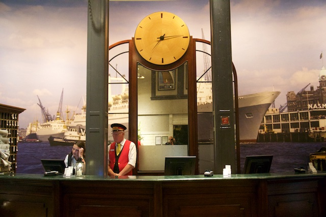 The Hotel New York is right next to the cruise terminal. With good reason. It used to be the headquarters of the Holland America Line, which was originally a very old shipping company that first started taking Dutch people back and forth to America in 1873. Barbara, the Location Guide had told us that the inside of the hotel was kind of a museum of the old Holland America company, so since we were right there we went in. (MB1!) The place was like a cross between a very old company office, and a very old steamship interior. Very strange. We walked around a little and took some pictures, and then walked a block back to the cruise terminal and went back on the ship.