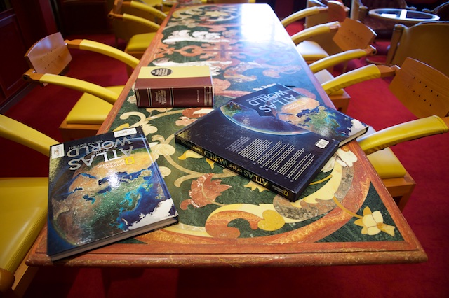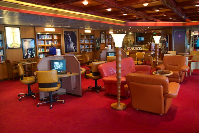The Crow’s Nest is also a bar, and at night has the B. B. King music venue. It has some very comfortable reclining chairs with ottomans, facing directly forward and looking out the big windows. It also has some comfortable couches. The library has big overstuffed chairs, similar comfortable couches and lots of bookshelves, well labeled and arranged by categories. It also has tables with computer screens, tables to play games on, cabinets containing board games, chess sets, backgammon sets, a big table where people work on huge jigsaw puzzles, and several large atlases.