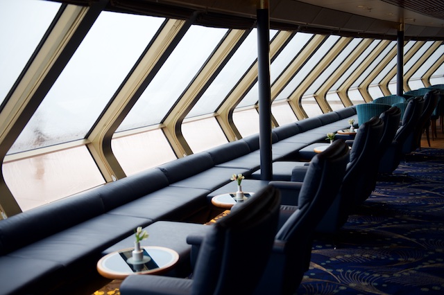 Just for fun, and to add several hundred words to this skimpy document, let’s discuss interior design, shall we? I’m talking about the design of the interior of some of the public spaces on this ship. I’m convinced that there were two separate designers or design teams. Why? Because there two different kinds of spaces. There are a couple of places on the ship where there are very comfortable seats, couches, relaxing decor, just the right amount of light, etc. One is the library, which they call the Explorer’s Lounge, possibly just to confuse people, and the other is the, often mentioned, Crow’s Nest.