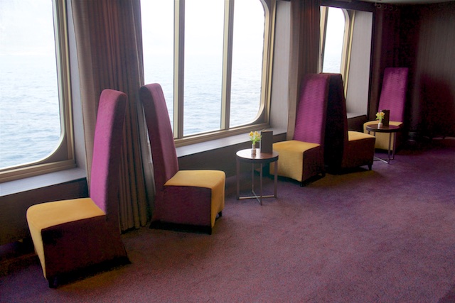 Then, in contrast, there are several bars on deck five. They have taken what must have once been a bar and divided it into three areas, a Martini bar that only serves Martini’s made with Grey Goose Vodka (a co-marketing deal, obviously), a Champagne bar, and an ale and spirit bar, each with a slightly different decor. What’s different about these bars? They have very uncomfortable chairs, dark coloring, and low lighting. Guess what? The Crow’s Nest and the library are almost always crowded. The three bars are almost always empty. One of them has these strange purple and yellow chairs with high vertical backs and hard seats that are so uncomfortable there is almost never anyone sitting in them. What idiot picked out these chairs? Did they think that having very uncomfortable chairs in a bar would attract business and make money for the cruise line? Did they even try the chairs before buying them?