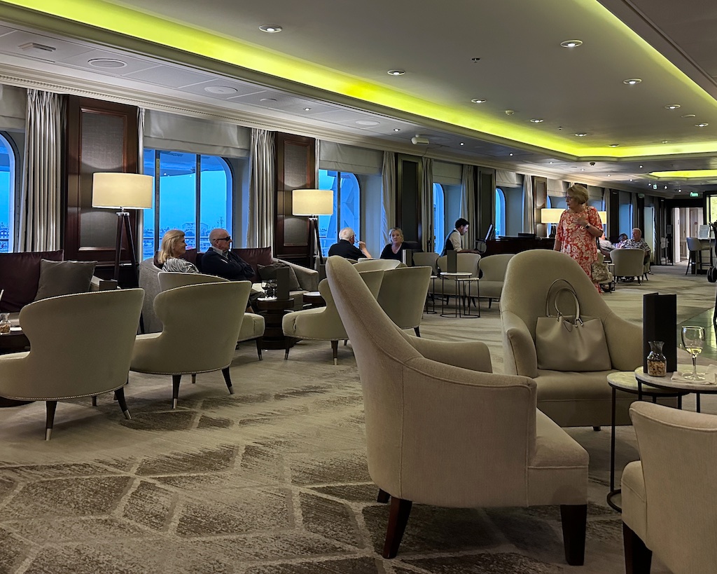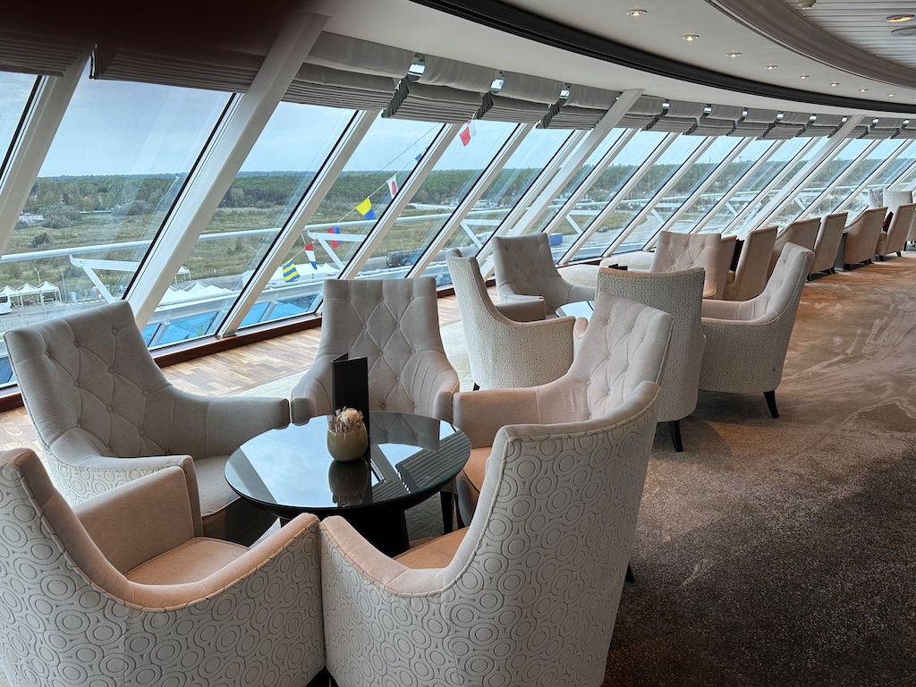 After lunch we went up to the Living Room a very airy, comfortable lounge area at the top of the ship with beautiful views out the front and very comfortable chairs and we did a crossword puzzle and had beverages, free beverages!.