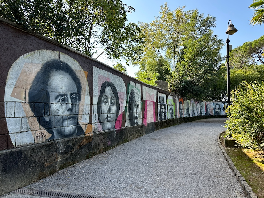 After chilling on our balcony for a while we headed out. We got onto Croatian soil, or more accurately, concrete at 10:45. We soon found a park containing something called the "Walk of fame" which was a wall covered with several mural drawings of famous people, a few of whom I recognized, like Albert Einstein, and many others that I never heard of. We walked through the park which also had a large variety of unusual trees, including a California Sequoia.