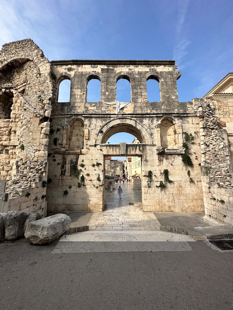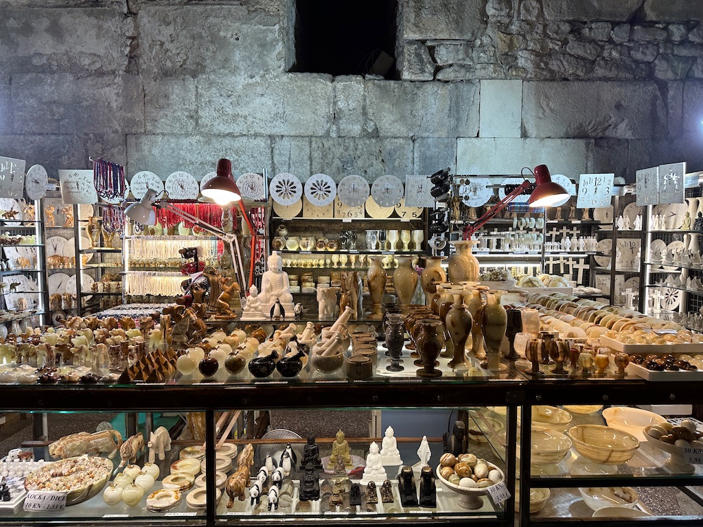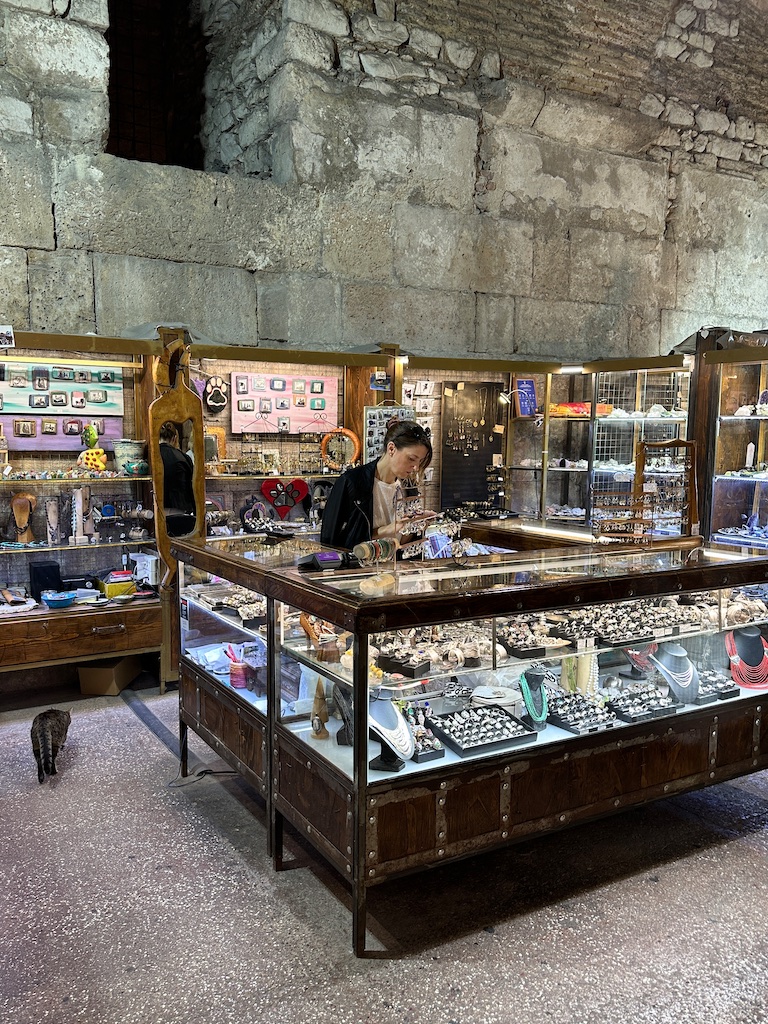 Split is famous for Diocletian's Palace which is an ancient palace built for the Roman emperor Diocletian around 300 AD. Its remaining parts comprise about half the old town part of Split. We walked through the Brass Gate (which isn't brass) down some steps into an old interior space called the Palace Basements, which is now occupied by some vendors selling things like antiques and collectables.