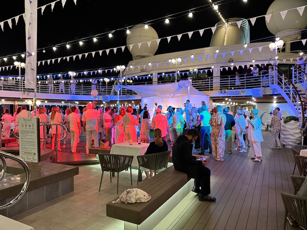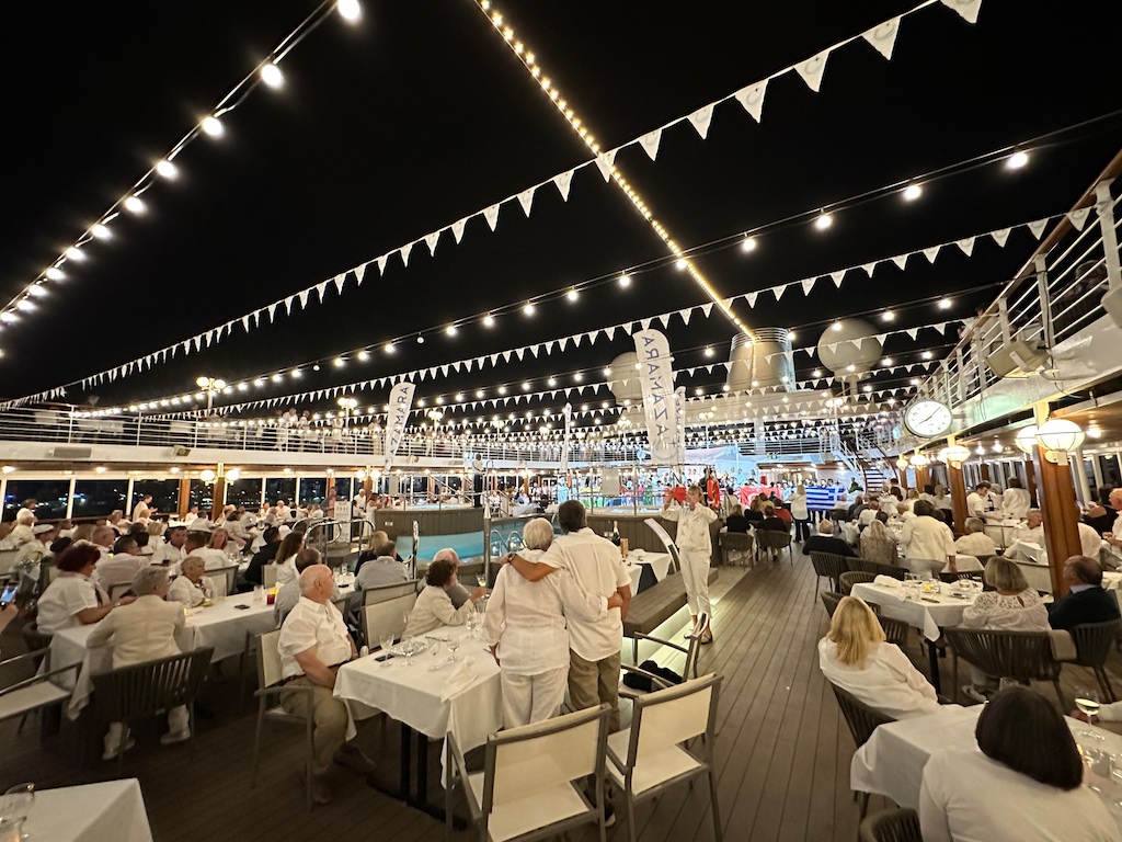 At 6:00 the "White Night" event started on the pool deck. This is a feature of all Azamara cruises. It's a buffet dinner and party on the pool deck (weather permitting) where everyone is requested to wear white if possible. Some people took this request a little far - wearing their terrycloth bathrobes with towels wrapped around their heads. The deck was decorated with lights and lots of tables and chairs.