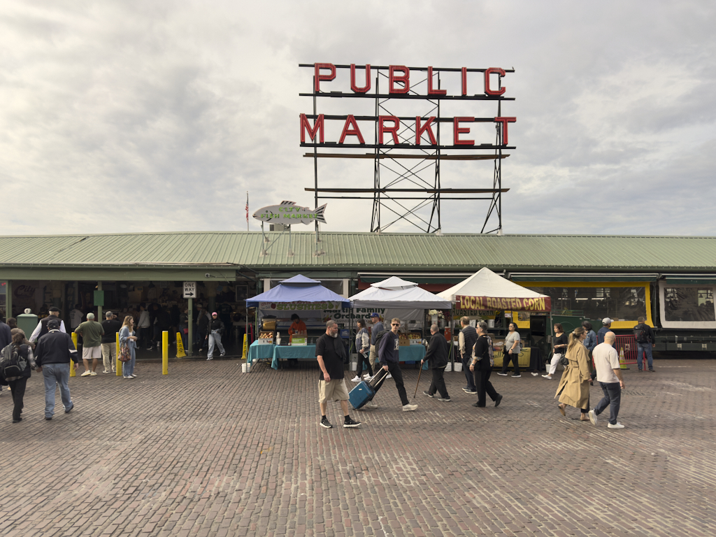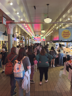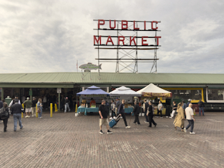 We walked a short distance to one of the more popular tourist destinations - the Pike Place Market. We had been there before in 2006. It was much larger and more interesting this time, but a lot of the little shops and eateries were exactly the same as they were 19 years ago! One of the best features of the place is that they strictly enforce a rule that all the businesses be privately owed and not part of a chain, with one exception - the original Starbucks is there. This means that the shops still have the uniqueness of the old "mom and pop" stores of the past, which we love. I think a lot of the visitors love this also.