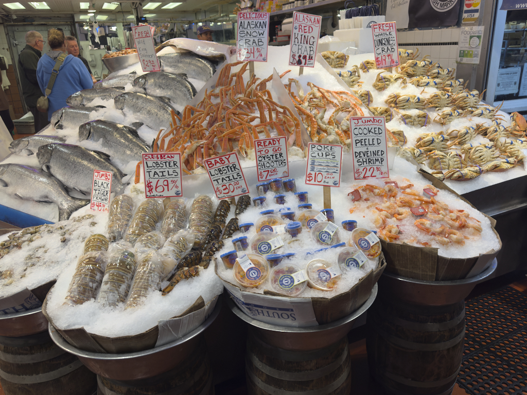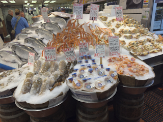 We wandered around the Pike Place Market for a couple of hours, had a seafood lunch at one of the restaurants in the market, with a waterside view, and then wandered around the market for another hour. We bought a bag of dried west-coast cherries and another bag of chocolate covered ones. There were a lot of other items that tempted us but we didn't want to carry more stuff around for the next six weeks. After the market we walked along the harbor walk, an extensive, attractive, waterside promenade with more shops and eateries. It had just been updated and extended. It made the waterfront a pleasant place.