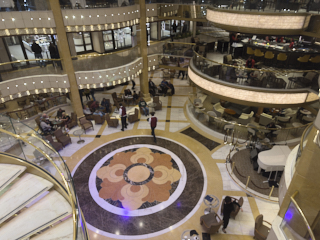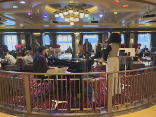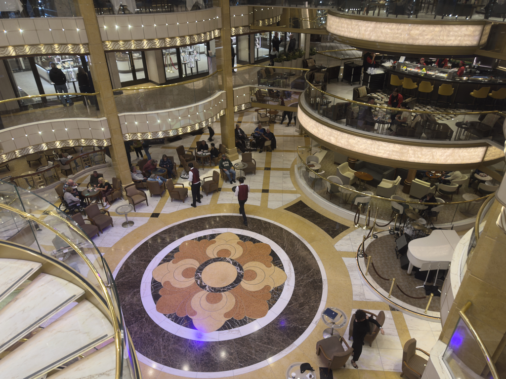 Observation: There are almost no quiet places on the ship to sit - almost all seating areas are continuously used for music performances, sales pitches, “art” crap, game shows, pseudo-health talks, etc. Many of the lounge areas are right off the atrium and so are bombarded with the sounds of the numerous events in the Piazza at the bottom. We finally discovered that they allow people to use the Crown Grill restaurant during the day as a quiet "reading" area, but only between 9 AM and 3 PM. We used it frequently.