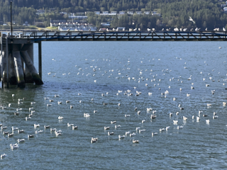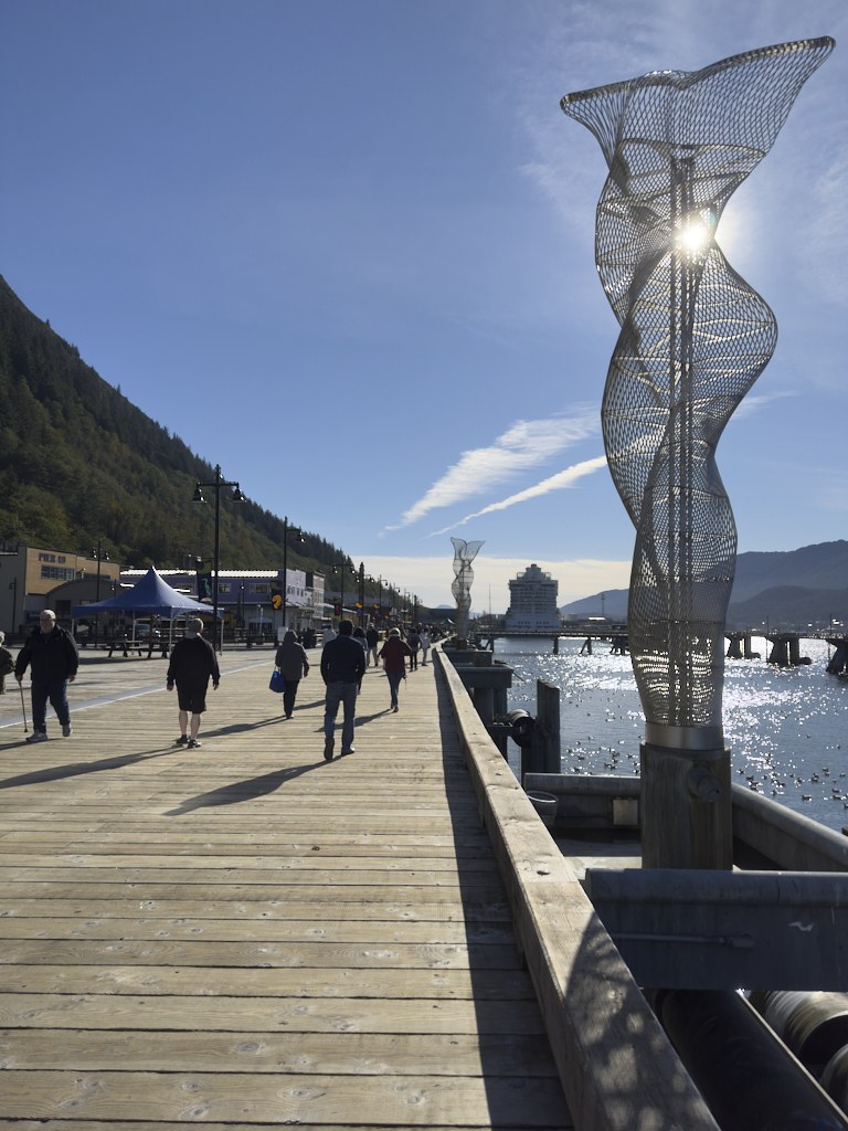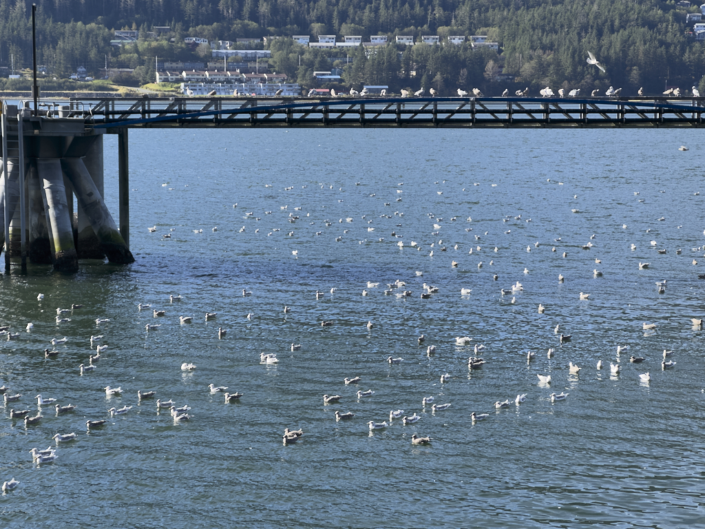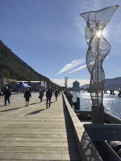 Juneau is long but narrow - only two blocks wide in some places. We walked along the boardwalk which had many totem poles, created by local Native American artists. They were very attractive and all very different. After the end of the boardwalk we walked along the shore where there were a huge number of seagulls.