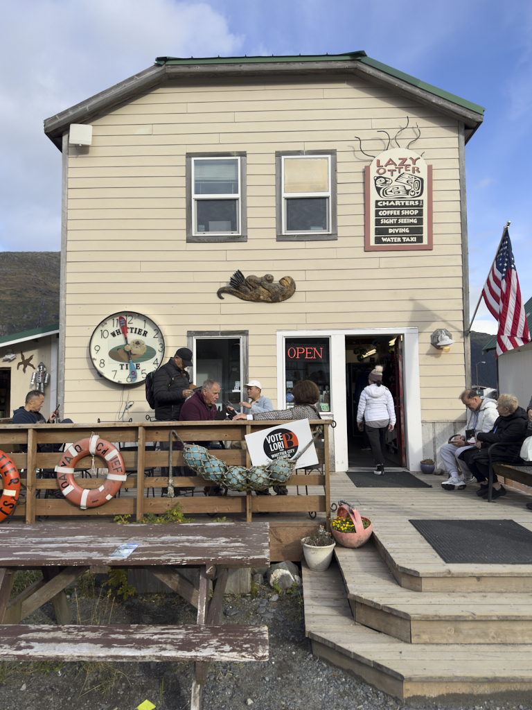 Past the tracks there was just a number of industrial buildings, and the “residential” area of town which was the aforementioned apartment building that houses the entire population of Whittier. Nothing looked like a "downtown".Whittier had more to see than we expected. The highlight: Donnie bought a refrigerator magnet at the "Lazy Otter Cafe". I didn't say anything even though our refrigerator has so many magnets on the door that I keep expecting it to topple over. We looked for the bagel store that was on our iPhone map but it wasn’t where the map said. We were really looking forward to Whittier, Alaska authentic bagels. Surprisingly we spent two hours in Whittier. From the research we had done before the trip we had expected to see all of Whittier in fifteen minutes.