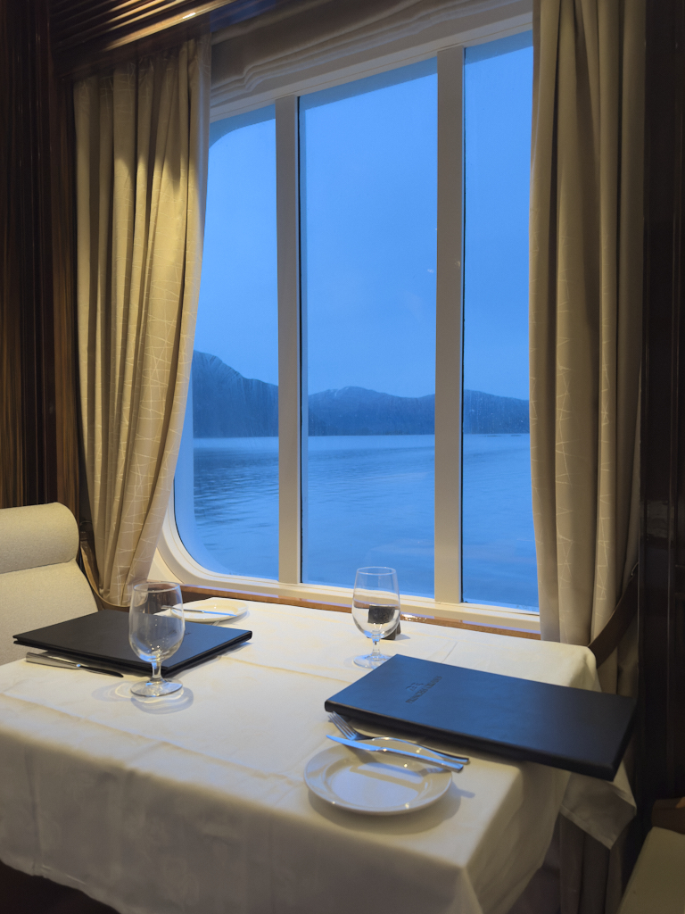 After leaving Seattle harbor the ship started rocking a little. As the evening progressed the rocking got a little more noticeable, but nowhere nearly as bad as we had experienced on other cruises. It really wasn't a problem, except when we went to bed there was a very loud, almost continuous banging/creaking noise from the closet all night. It kept me awake all night. We also discovered a stupid motion activated light on the bottom of my nightstand, presumably for safety reasons. We had experienced a motion-activated light in the ceiling between the closet and the bathroom on a previous cruise on the Enchanted Princess. This room had that also. At our age, we both have to get up in the middle of the night to use the facilities, and the light would wake our partner. This time I was smart - I brought some aluminum foil and scotch tape and covered the motion-sensor. The same trick worked for the light at the bottom of the nightstand.