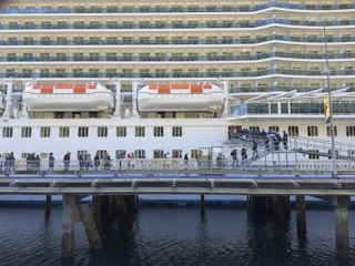 When we got near the ship we saw that there was now only one gangplank open and a very long line to get onboard - at least a hundred people long. Not only that, the boarding line had to stop completely when a passenger with a walker, scooter, or wheelchair wanted to to get off the ship. They had to hold the line until the gangplank was empty, slowly help the disabled passenger go down, and only when they reached the bottom, let the line start up again - a very slow process.