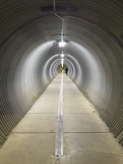 The part of town near the dock contains a number of very small wooden buildings containing cafes, tourist shops, places to rent canoes or book tours, etc. It's the tourism commercial part of the tiny town.To get to the area called “downtown" we walked in a long tunnel made from corrugated culvert pipe under the railroad tracks, which bisect the town.