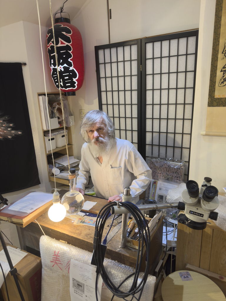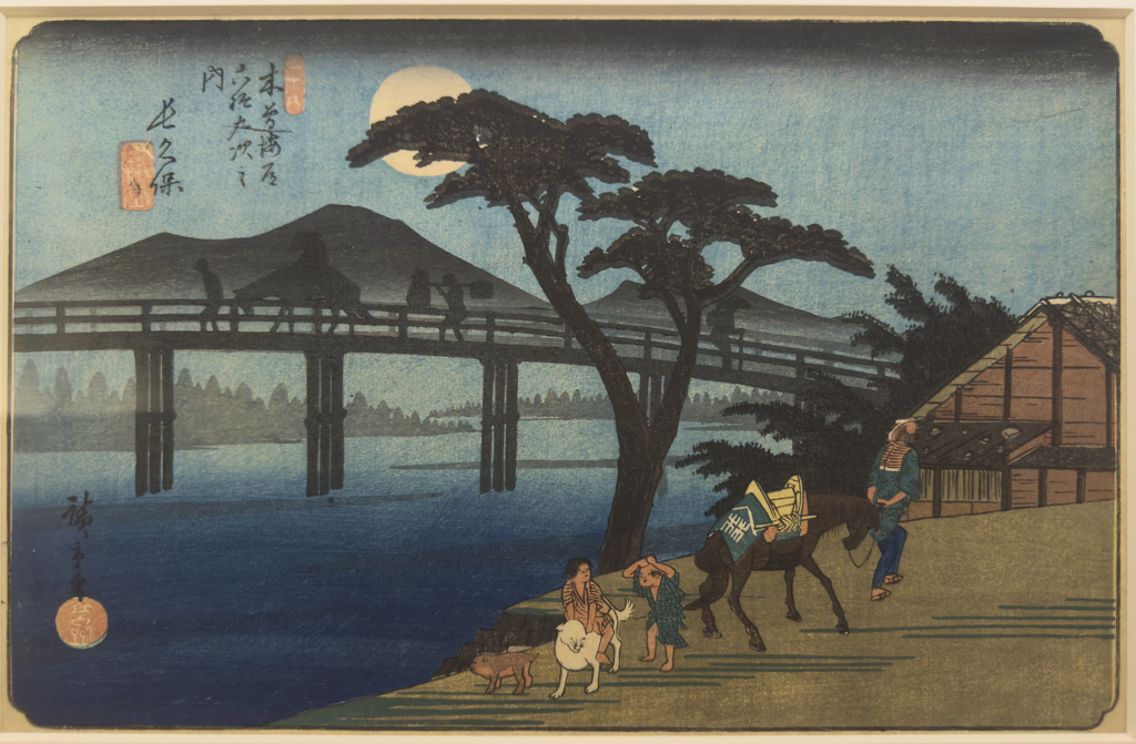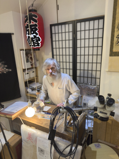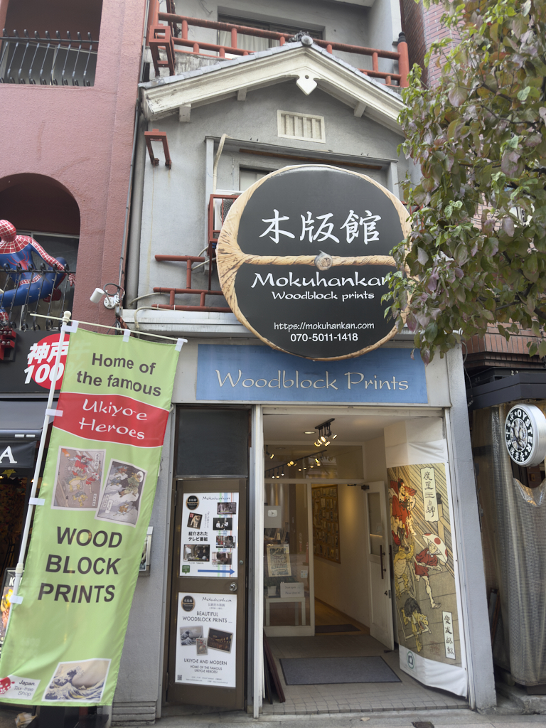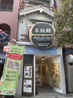 I had first heard about it by accidentally finding some Youtube videos by a man named Dave Bull, the shop's owner and master craftsman. He has made a large number of Youtube videos about the process of making woodblock prints and also their history. The videos showing him carving the tiny intricate details into a block of wood are amazing. If you want to watch someone with infinite patience and incredible skill I highly recommend his videos.It took us a little while to find the shop but when we went in I was surprised to see Dave Bull himself sitting at a little table right near the entrance, working on something. I greeted him and we chatted briefly. We bought two prints, one an older print, its label reading "Postwar" and one carved by Dave Bull himself and printed by his staff, both, however, were made from drawings by the now world famous artist, Hiroshige. This is typical. Works by Hiroshige and other famous Japanese woodblock artists have been reprinted and re-carved many times over the decades. Hiroshige just made the original drawings, the woodblock carving and printing were done by artisans who worked for the publisher, who may have reprinted the artwork many times.