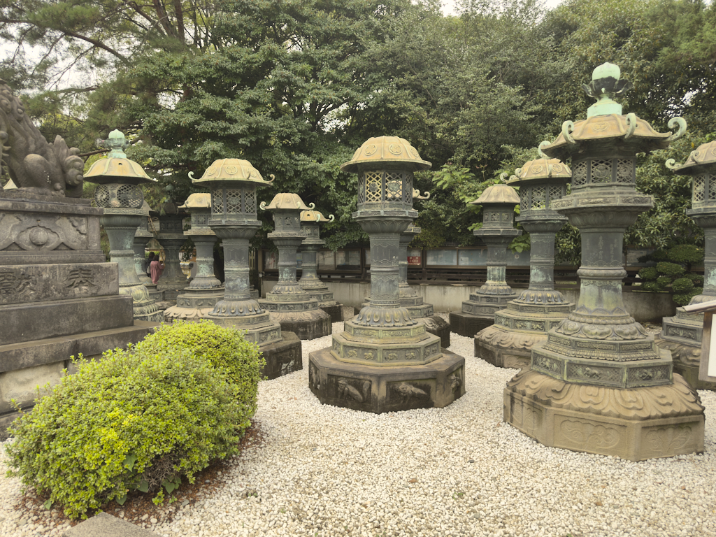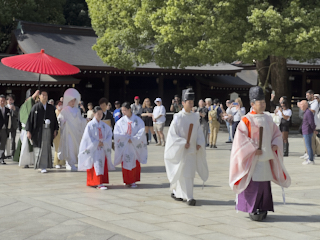 More amazingly, three times during our stay at the shrine, some guards came out and directed people to move out of the way and a procession walked slowly through the main courtyard consisting of some Shinto priests and other officials in traditional costumes and then a bride and groom, also in very traditional Shinto costumes, followed by the rest of the wedding party, the men in black suits, some of the women in Kimonos and others in formal dresses. It was quite an unexpected sight the first time. It was even more unexpected when there were two more. We later learned that many Japanese like to be married in the traditional Shinto manner.