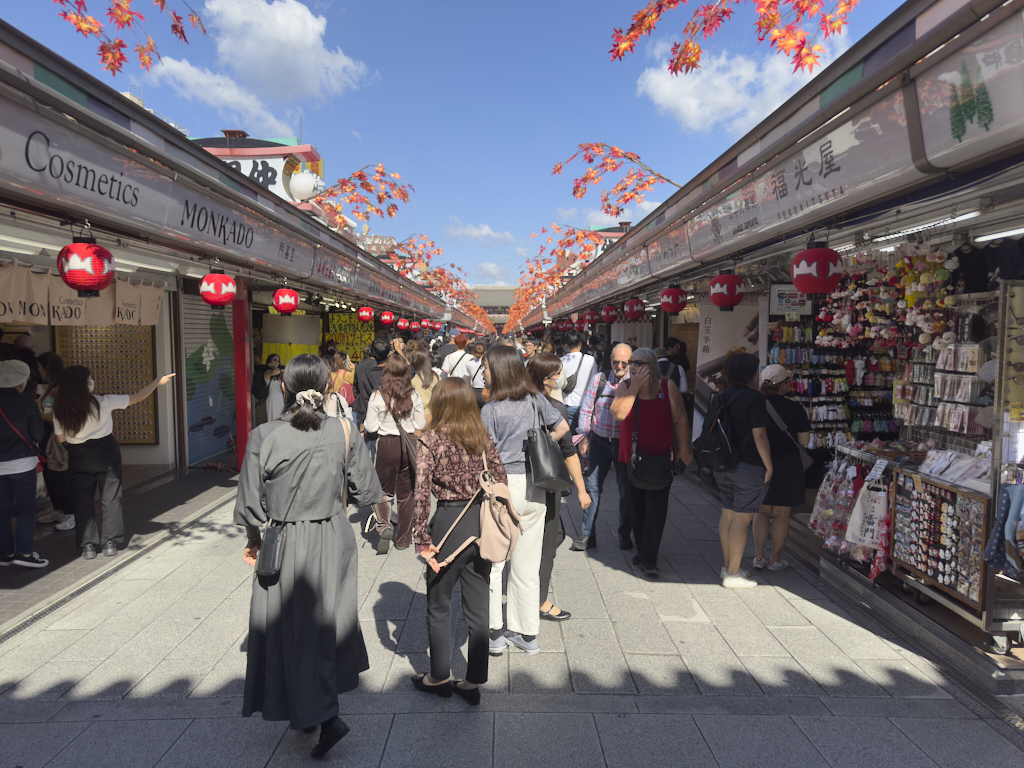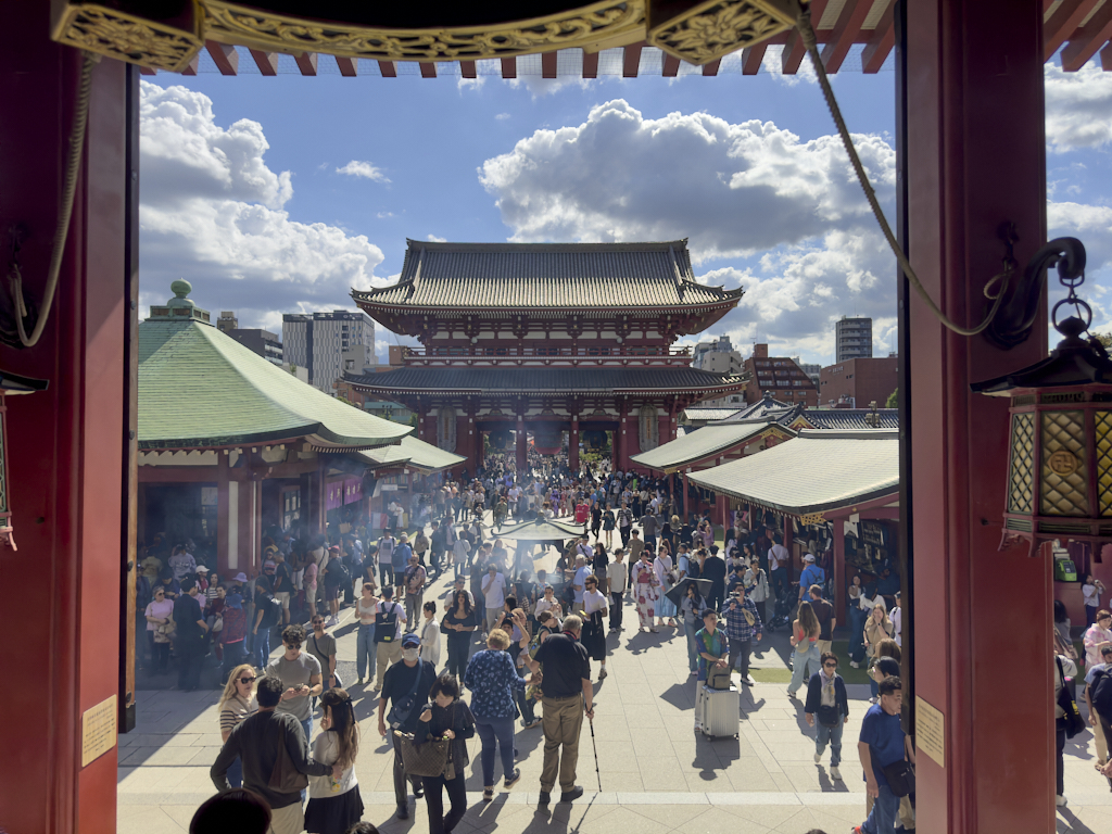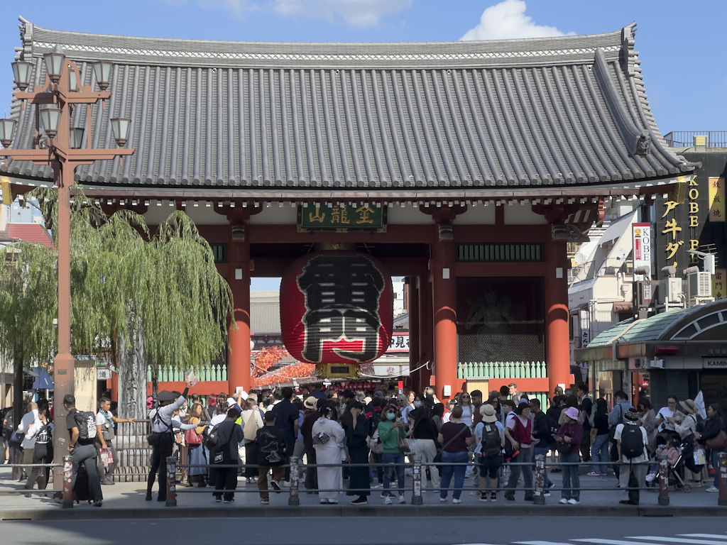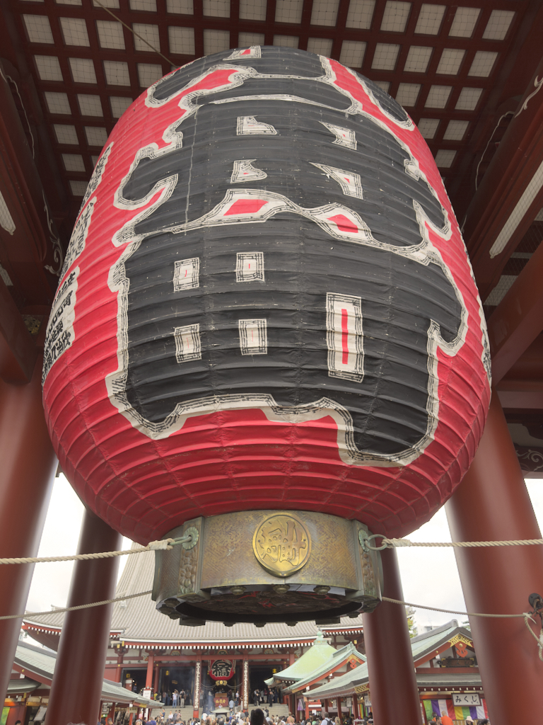 But - and this was the best part - recently Apple reached an agreement with the Tokyo transit companies so we could load a Suica card onto our iPhone Wallet app, and fill it with money using our regular Apple Pay credit card in the same wallet, just with a few clicks. In addition Apple has a transit payment feature in the wallet that allows you to tap at transit locations without even turning on your iPhone. It worked like a charm. Many Japanese people were using their smart phones to do this too. Many of our subway rides cost a whopping $1.11. The cards are also usable in many small shops, convenience stores, small restaurants, and vending machines, many of which don't take credit cards.It was a sunny day! - a miracle. We were anxious to get out into the sunshine and visit some outdoor sights that we would love to photograph, but we were well aware that it was a very bad idea to get on a train during rush hour. So, in the late morning we took a train to Asakusa. Asakusa is a district famous for the Senso-ji Buddhist temple complex, a tourist mecca. Exiting the Asakusa subway station, we walked a couple of blocks to the giant Kaminarimon gate.