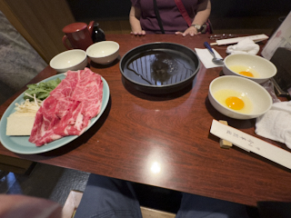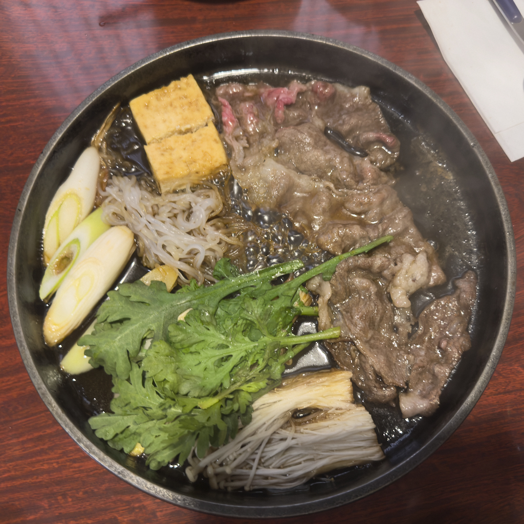 We went in and were greeted by young Japanese ladies in kimonos who seated us. Everything inside looked traditional, very authentic and attractive. We ordered Sukiyaki for two. It was a very good choice.Our waitress, in her kimono, took a cover off of the round burner in the center of our table and placed a round, flat pan on it and turned on the gas burner underneath. She then brought over two little bowls containing a raw egg each, two other small bowls she placed in front of each of us, a large pot with a spout containing some kind of savory sauce, a set of two long chopsticks, and a big plate containing vegetables, noodles, tofu and several big very thin slices of Wagyu beef.