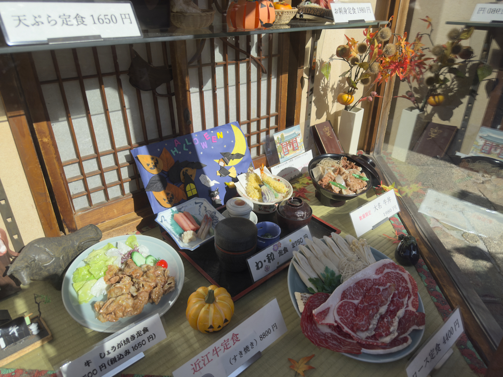 We put a 100 yen coin in a slot, purely on the honor system, of course. We then shook a heavy hexagonal prism shaped metal container with a little hole in one end. We shook it until a stick dropped out. The stick had a number on it and we went to the little wooden drawer with a corresponding number and took out one of the many paper fortunes inside. Our fortune turned out to be a good one. If you get a bad one you can reject it by tying it to a little wire rack nearby.We were hungry so we went to look for a place to have lunch. The Nakamise street stalls run down the middle of the street but behind the stalls on both sides are side paths and other stores and restaurants. We wandered down one of these paths to avoid the crowds and saw what looked like a nice traditional restaurant. We couldn't read any of the signs but like many Japanese restaurants their window had displays of plastic versions of the food they served and the items looked good.