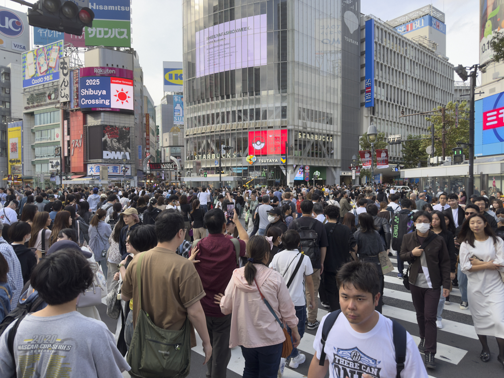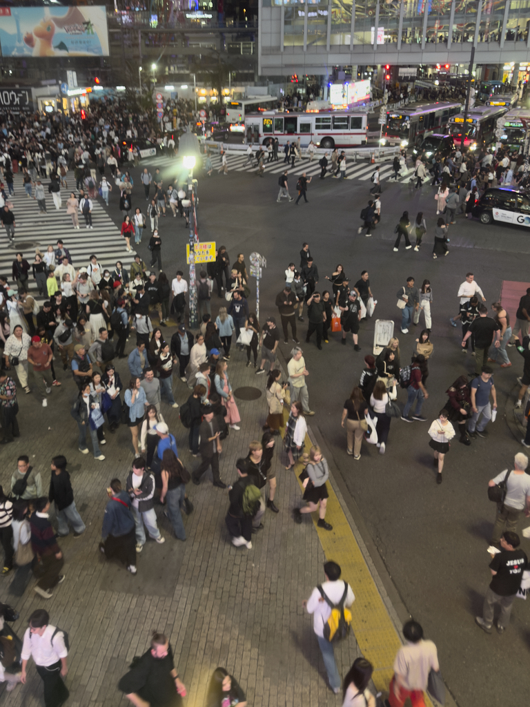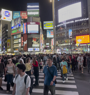 Shibuya Crossing is the world's busiest pedestrian crossing, with up to 3,000 people crossing during a single green light cycle. The lights are set up so that all roads are stopped at the same time and people cross in all directions at once. We stood at the curb, waiting for the stoplights to change, along with a few thousand others, and when it did, instead of crossing we took lots of pictures of the giant crowd crossing in every direction.