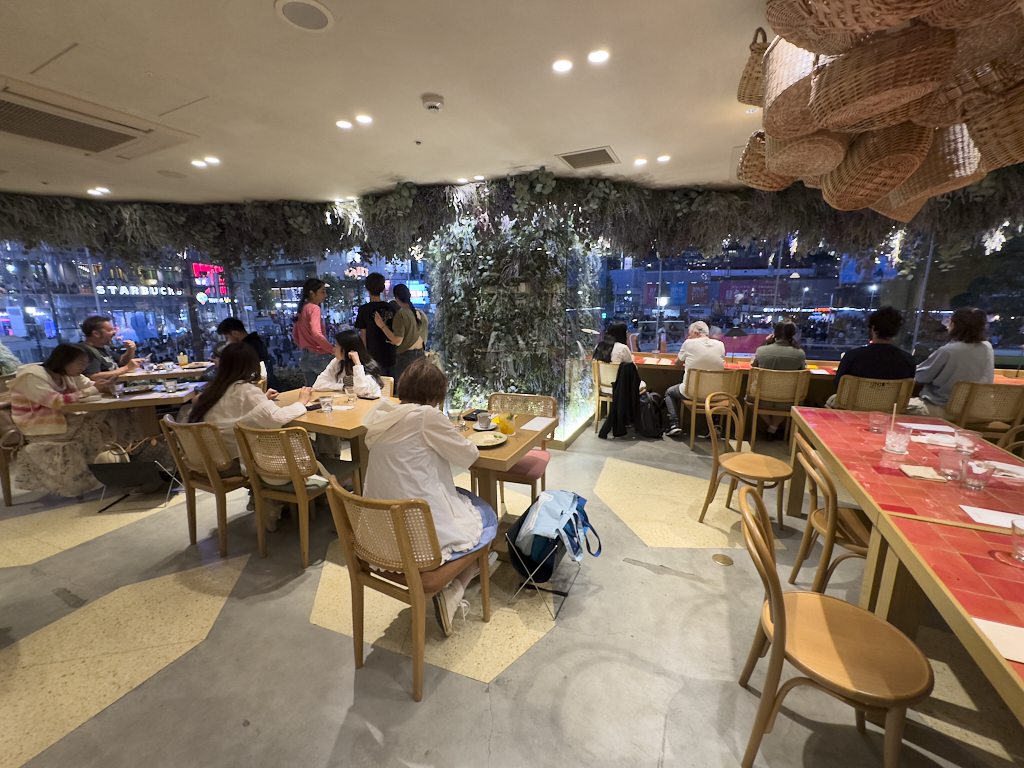 We wanted to get a better view, and we had read that there was a good view from the Starbucks on the second floor of one of the buildings right on the intersection. We went up and even though the Starbucks was crowded, we managed, after waiting a couple of minutes, to find room by the window to take a few more pictures.