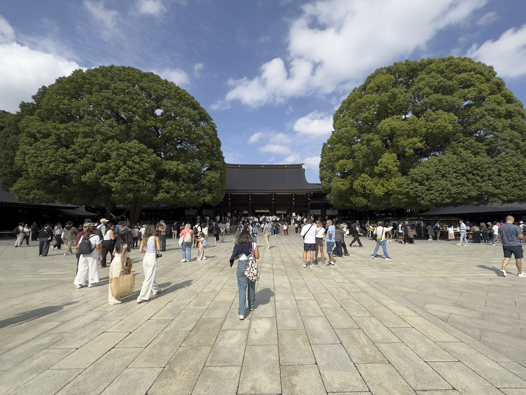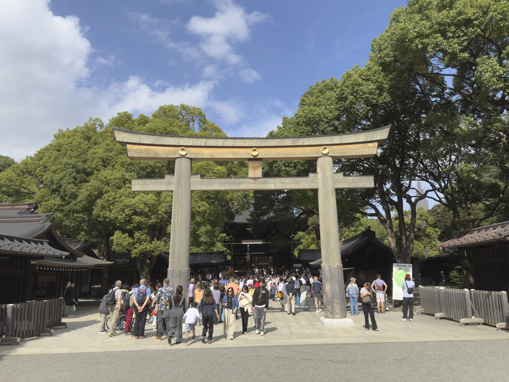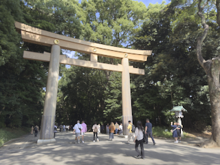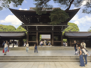There was some sun and some clouds in the sky. We wanted to go to the Meiji Jingu shrine. We had been there before on our previous trip to Japan and we remembered it as a very beautiful and peaceful place. It was back in the Shibuya area but I wasn't going to walk a mile and half to a subway station this time. I figured out a better route, using commuter rail instead of the subway and we arrived after about 45 minutes at a train station that was only a few feet from the entrance to the shrine.