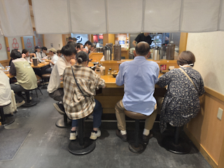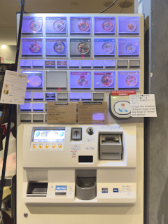The place, of course, was tiny. It could seat about 20 people but at counters or at common tables for eight. We used the ticket machine outside the restaurant to order and pay using our Suica card, which is how all the ramen restaurants worked. They did not accept credit cards.After a short wait we were seated at one of the common tables with six other people. Donnie tried the mushroom and soba noodle ramen and I had the soy sauce based broth ramen. I even did a very professional slurping job, which is the recommended technique. They even loaned Donnie a fork. The ramen was the best we ever had. A nice feature was that we had already paid so when we were done eating we just got up and left. Naturally, the staff said "arigato gozaimasu" to us as we left. It means "Thank you". This also happened almost everywhere we went. As I said elsewhere, the Japanese are very polite.