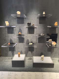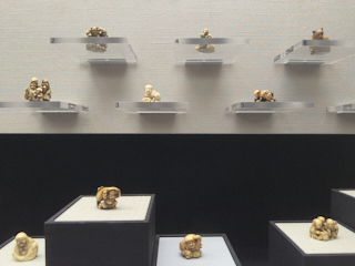 There were a lot of very beautiful objects but two of my favorite displays were some Netsukes and some wood block prints by Hiroshige. Netsukes were originally small and intricately carved toggles usually made of wood or ivory, used secure a purse or container suspended on a cord from the sash of a kimono, because the kimonos didn't have pockets. They have evolved into a magnificent art form and are prized objects, some of great value.