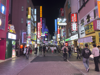 In the early evening we want back out and took a complicated multi-train ride to another of the sights on our list - Shibuya Crossing. On the way, we ticked off another item on our list of accomplishments, one that we had hoped to avoid. We rode the Tokyo Subway in the rush hour. We didn't actually experience the part that we had read about where uniformed attendants, wearing white gloves, push and shove people into already tightly packed subway cars. Our car had plenty of room - there was at least a quarter of an inch between people. At every stop nobody got off and a few people got on - ouch. We were wondering how we would get off through the packed crowd until I heard a welcome announcement - our stop was the last stop, and also, luckily, the door on our side of the car was the one that opened. When it did, we quickly got out and ran to the other side of the platform to let the mad rush happen behind us. Did I mention that Shibuya Station is one of the busiest in the world?